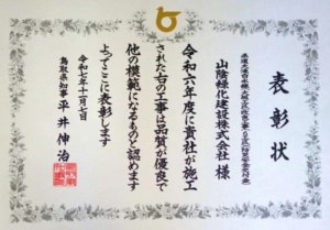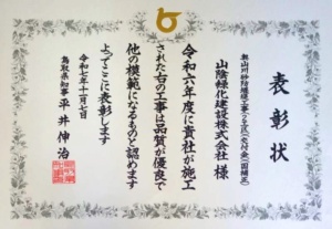11月7日に鳥取県庁講堂にて第25回住みよい県土づくり表彰式があり、優良工事施工者知事表彰を受賞しました。今回は、3つの工事現場でのトリプル受賞となりました。