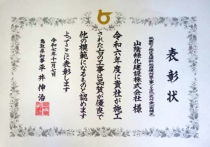 このような表彰は、建設の現場でものづくりを行うものにとって大きな励みとなっています。四半世紀の長きに亘り我々を励まし続けて下さっている鳥取県の取り組みに感謝と敬意を表すと同時に、発注者の方々、工事に関わったすべての方々、ご協力いただいた地域の方々に感謝を申し上げます。