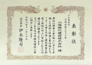 弊社が昨年度施工した河崎枝線その3工事が下水道部門で優良工事に選出され、伊木市長より表彰状をいただきました。